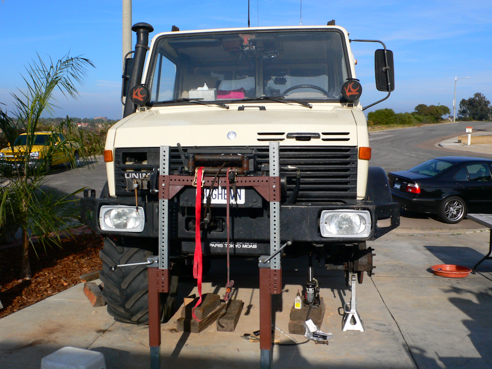 We repositioned the truck and put the jacks under the front winch. The front is the heavy end of the truck, but the jacks are rated at 5,000 pounds each so we had plenty of safety margin. That said, it was still a bit scary since we had to lift the frame more than 18 inches to allow sufficient axle droop.