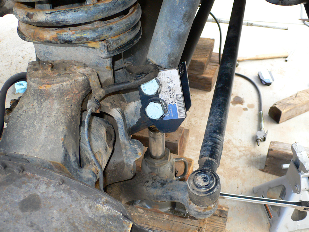 Not shown in photos is the brake modulator extension. On the 1300, connected to the rear drive shaft tube is a rod that "senses" the load on the truck. That information is used to modulate the braking pressures delivered to the calipers. Given the lift of the truck, the assembly would "think" that the truck is unloaded and therefore deliver poor braking performance. Upon inspection, it was seen that I could extend the limits of the rod without replacing or modifying the assembly. The original length of the rod was 235mm and I extended it to 250mm to account for the lift in the suspension. This extension resulted in good braking performance, on par with the XM-47 tires and an un-lifted frame.