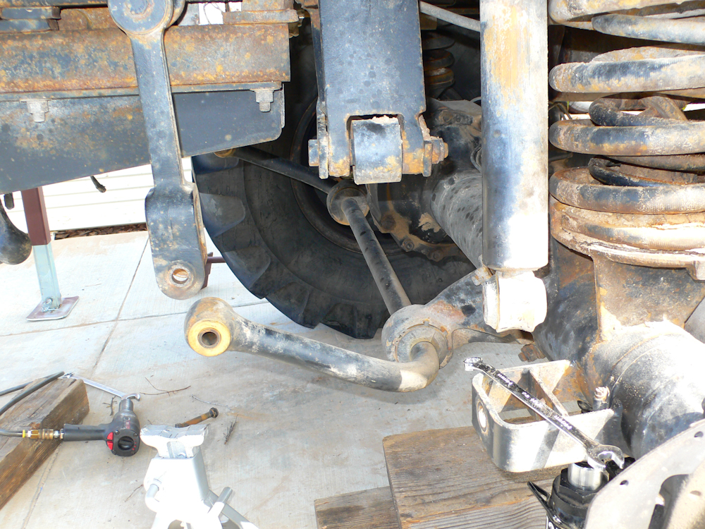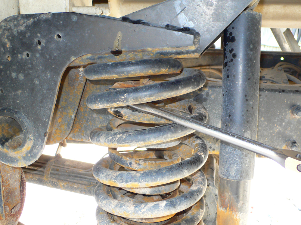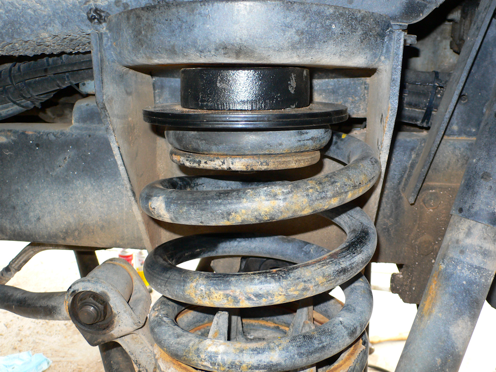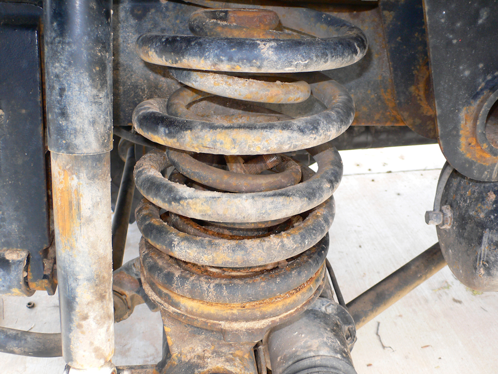 We started on the rear by raising the frame, removing the tires and lowering the axle assembly. Then the attachment bolts that hold the coils in place were removed. In the photo above, you can see the overload springs inside the main coil and the loosened bolt visible between the inner coils.