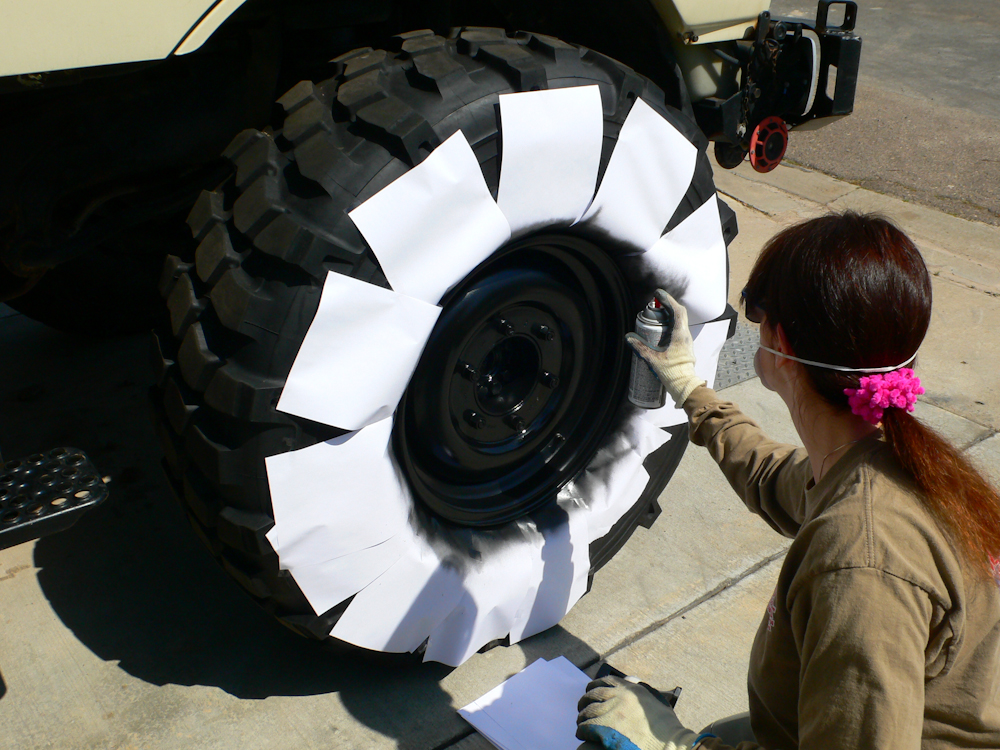 The wheels we were using were "new" so we needed to paint them. Above, Kathleen masks the wheels and spray paints them with medium gloss black.