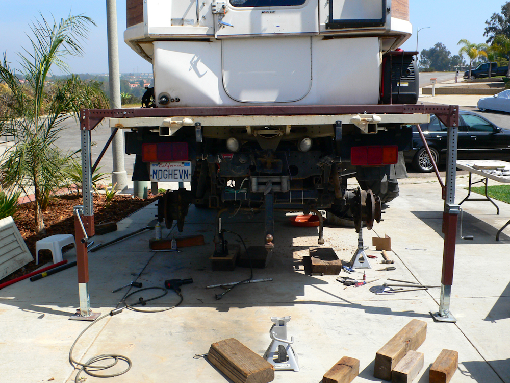 To get the job done, we had to remove both rear tires at once to provide sufficient droop and eliminate the skew in the axle that made reattachment of the springs impossible. In the photo above, you can see the support jacks that were originally designed to support the camper and frame if removal were required. This setup had sufficient strength and lift capabilities to support the entire rear of the truck, including camper.