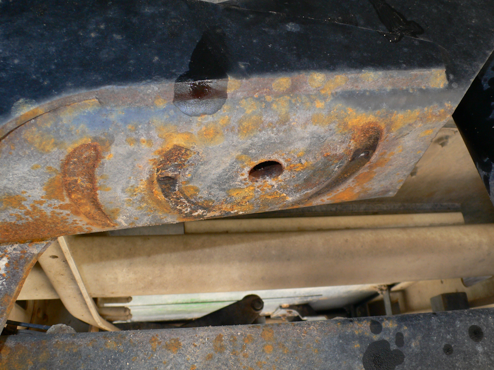 After some drilling and prying, the bracket came off. Note the big bubble of rust under the bracket location. This rust pocket is right beneath where I want to mount the bracket.