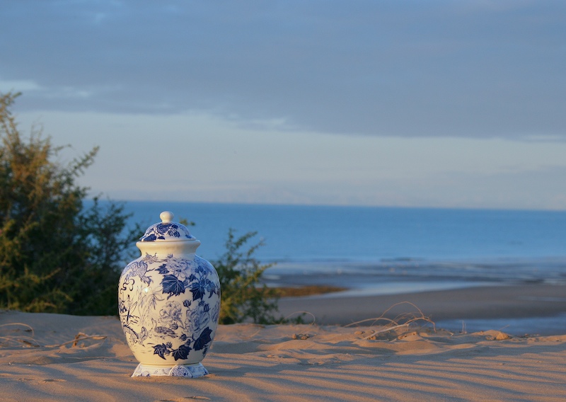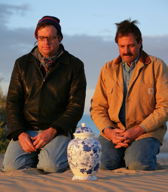 Kai's father suddenly passed away the week before the trip. Kai decided that he would spread his father's ashes in the dunes next to the sea. Here, Sven (left) and Kai pay their father's remains in the urn. This was a "by request" photo as opposed to an intrusion of their privacy.