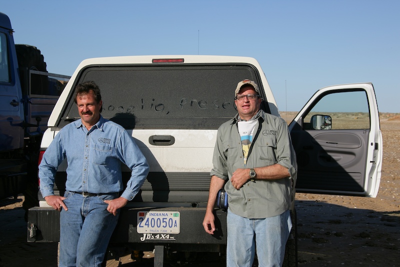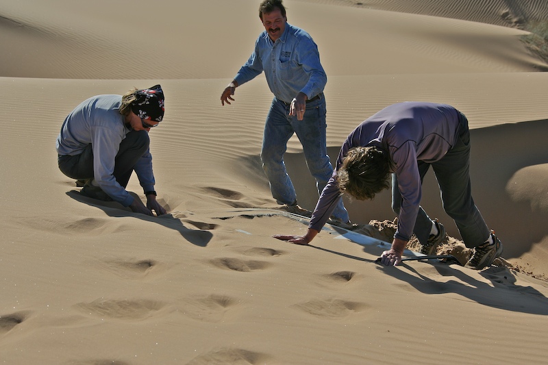 We discovered a fully intact Toyota that got stuck and was subsequently buried by the shifting sands. When we found it, only a small part of the roof was visible. Here Matt and Nancy attempt to expose some of the vehicle for inspection.