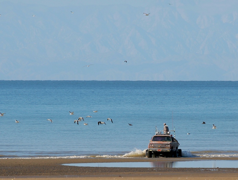 Local pescaderos launch their boat in the surf to the cries of hungry sea gulls.