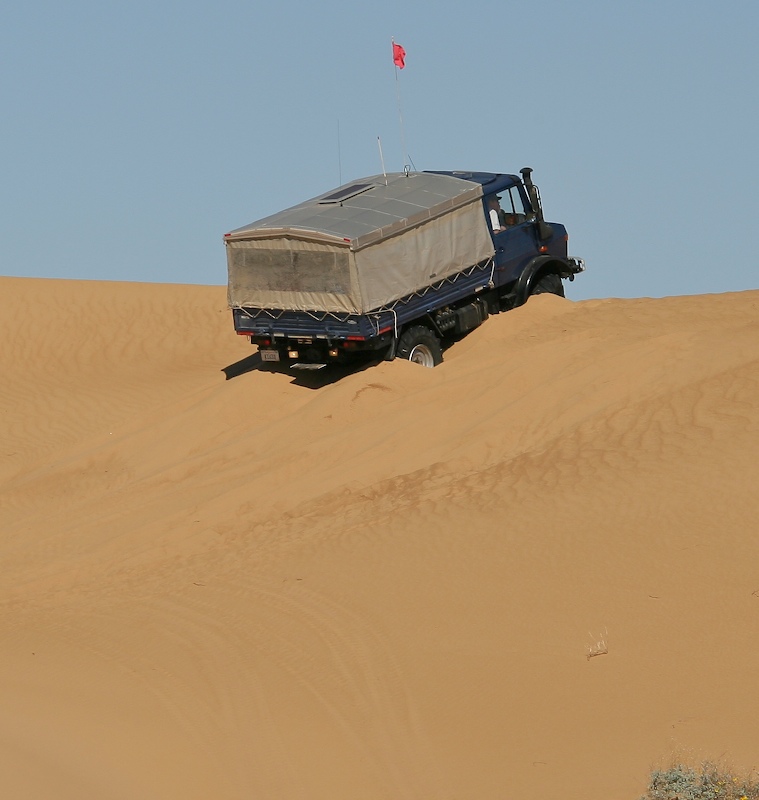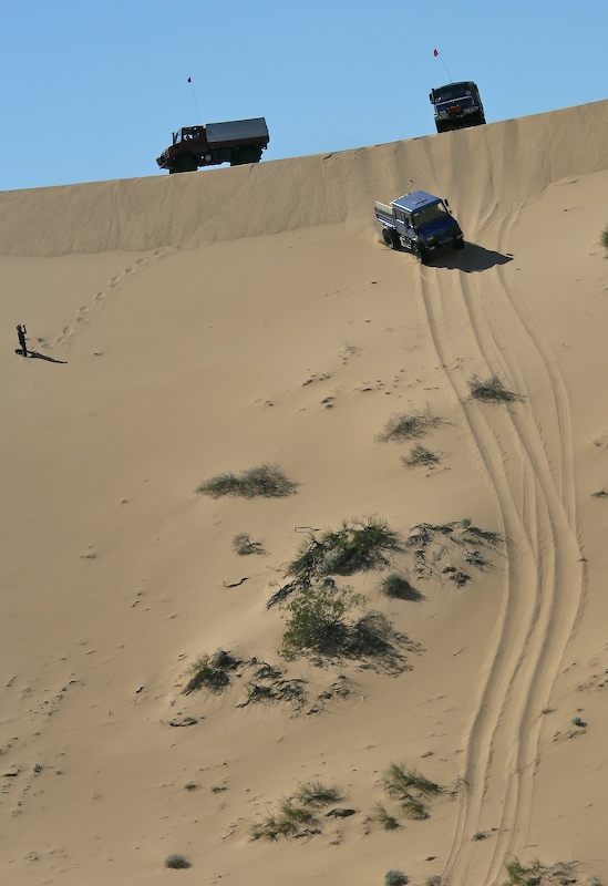 Mark having troubles getting over a steep razor back ridge due to the soft sand.