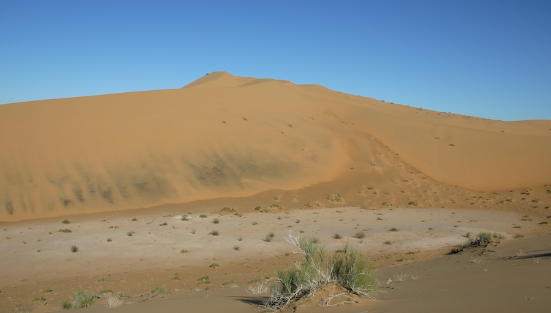 Hard pan valley with a mini-salt flat at the bottom. Note the dark sand that likely blew in from the volcanic Pinacate area.