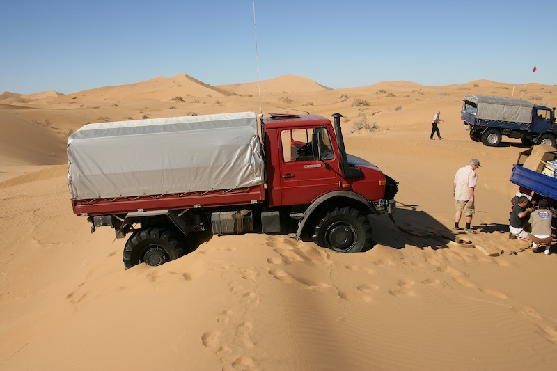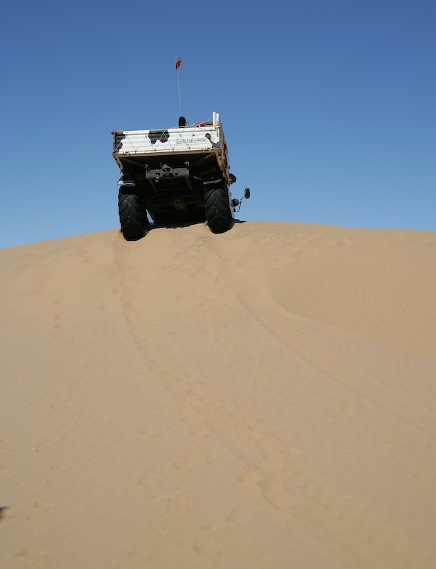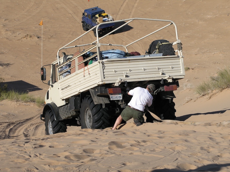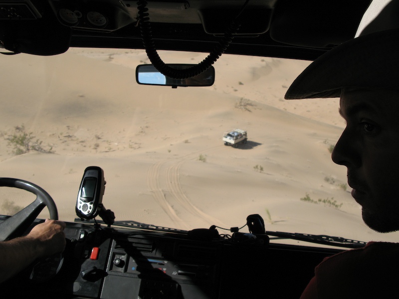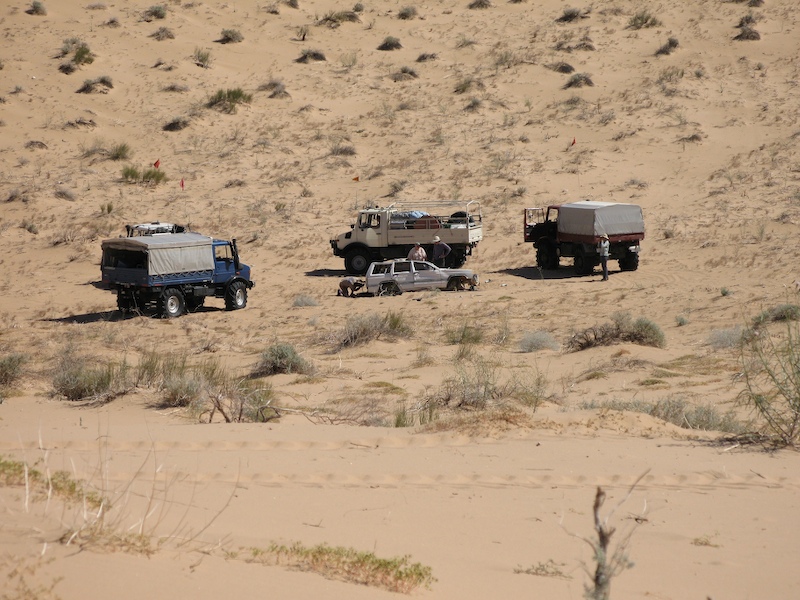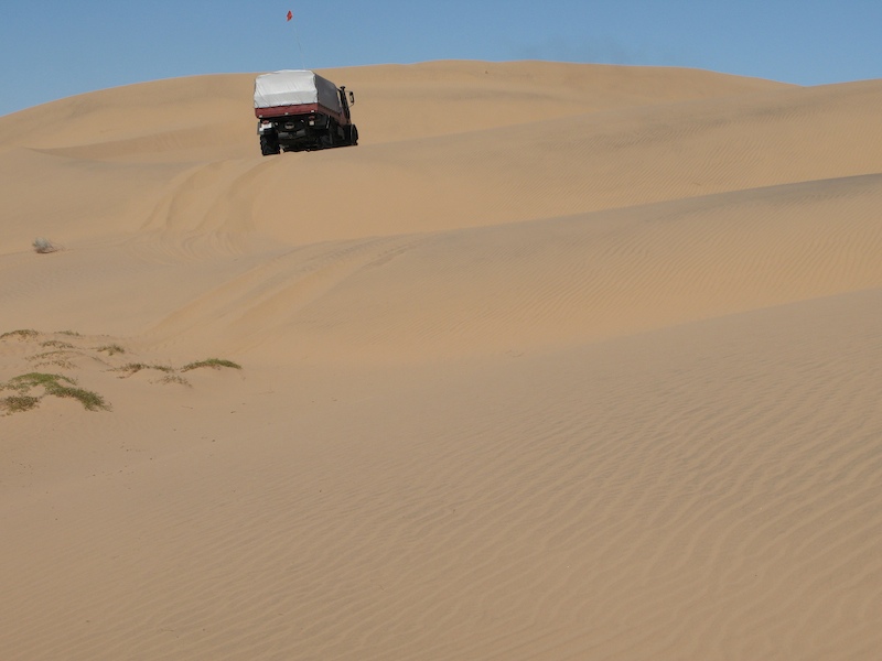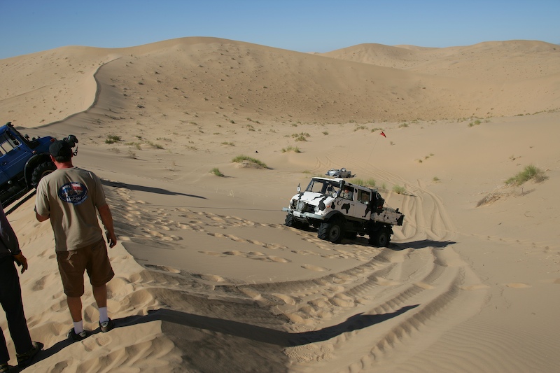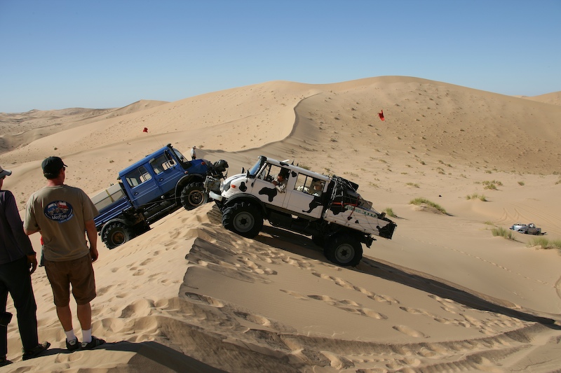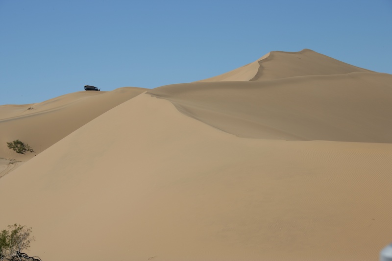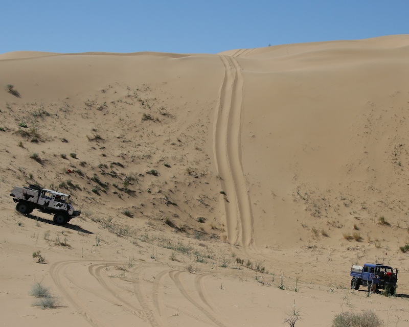 This was a normal dune travel day. There were a few close calls and all of us got stuck at least once. One obstacle require each truck to help the one behind up the steep section of the dune.