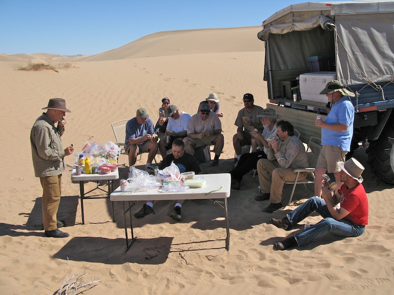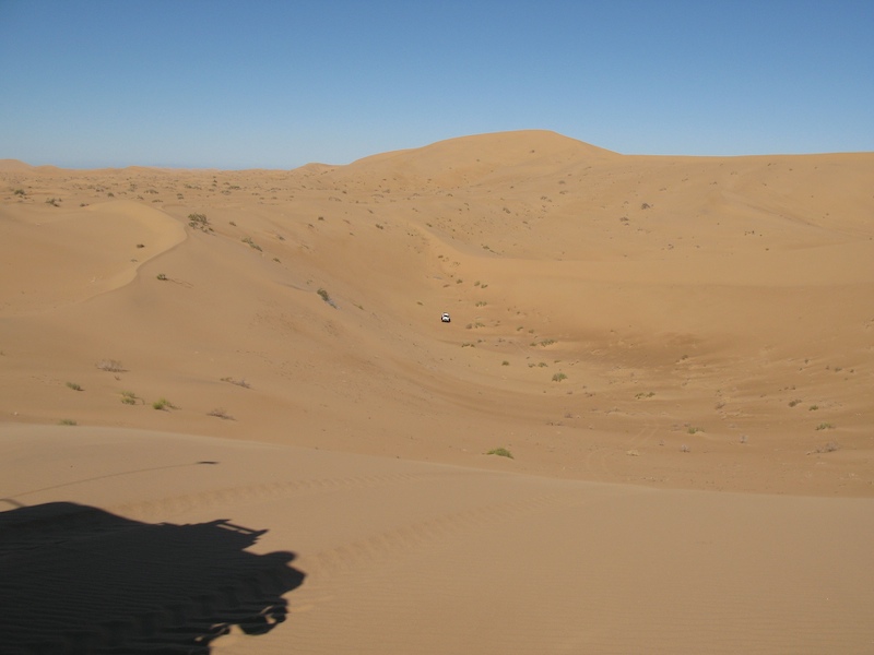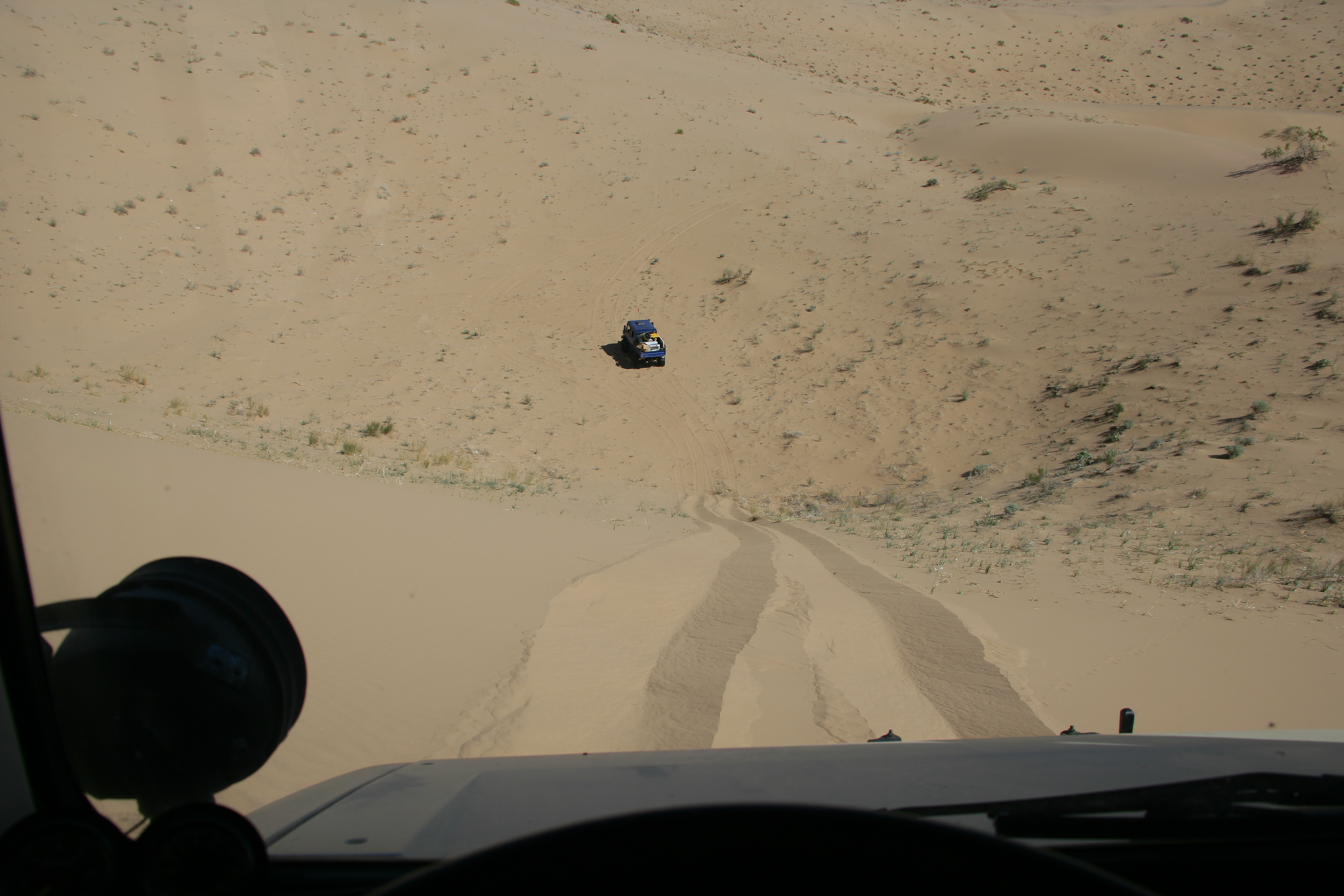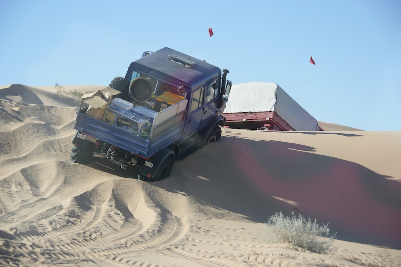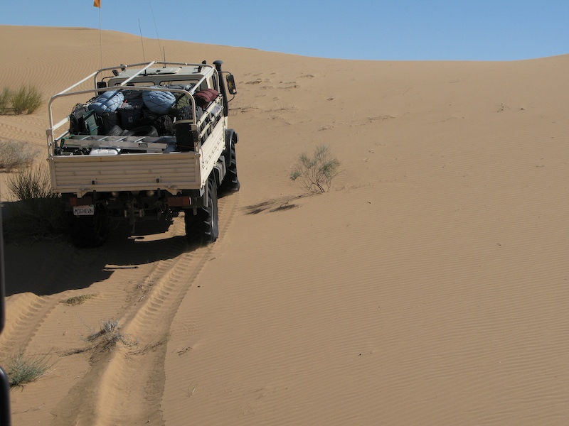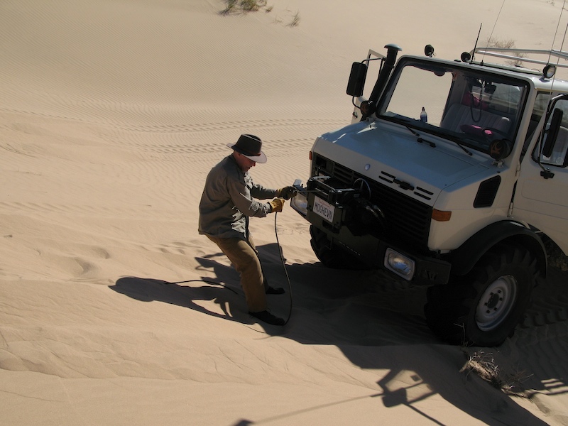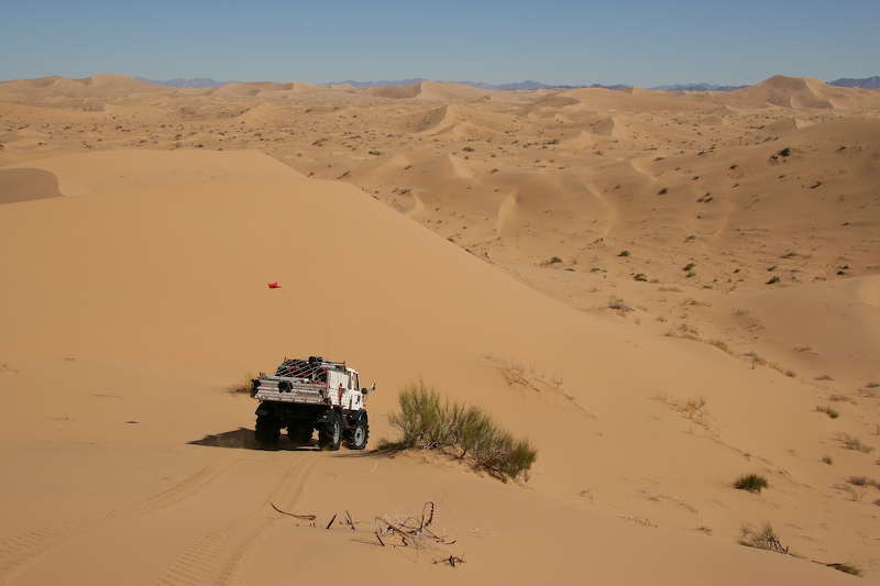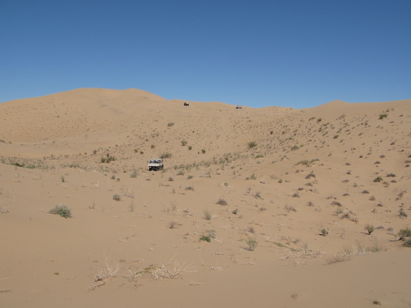 This was a normal dune travel day. There were a few close calls and all of us got stuck at least once. One obstacle require each truck to help the one behind up the steep section of the dune.