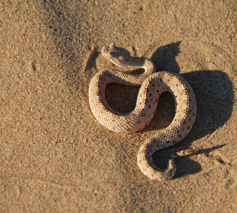 An unwelcome camp visitor. This sidewinder was quite small, so we just left him to his own devices and he wisely went the other direction. Note the horns on his head and his small button rattles.