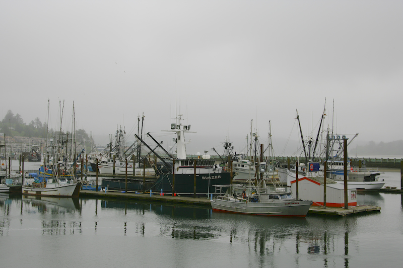 We ate at the docks on Yaquina Bay. These are active duty fishing boats. While we watched, a number of boats were being loaded and unloaded as part of normal business. The sky was overcast making photography difficult.