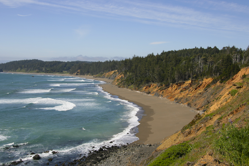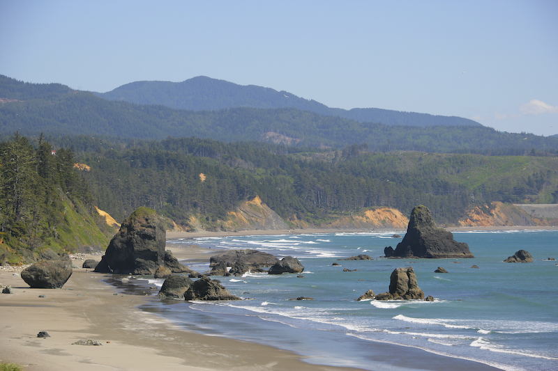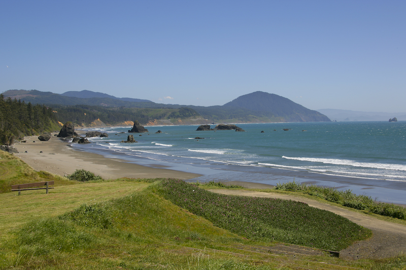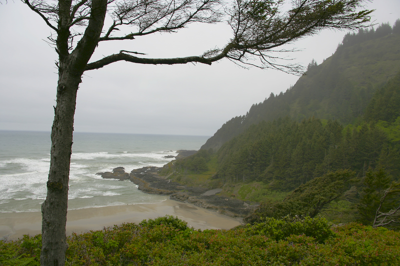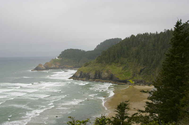 The Oregon coast has large cliffs and "headlands" that made building roads difficult and costly. But, these headlands also make for great viewpoints and awesome vistas of the rocky coast. This view is from the Cape Pepetua overlook.