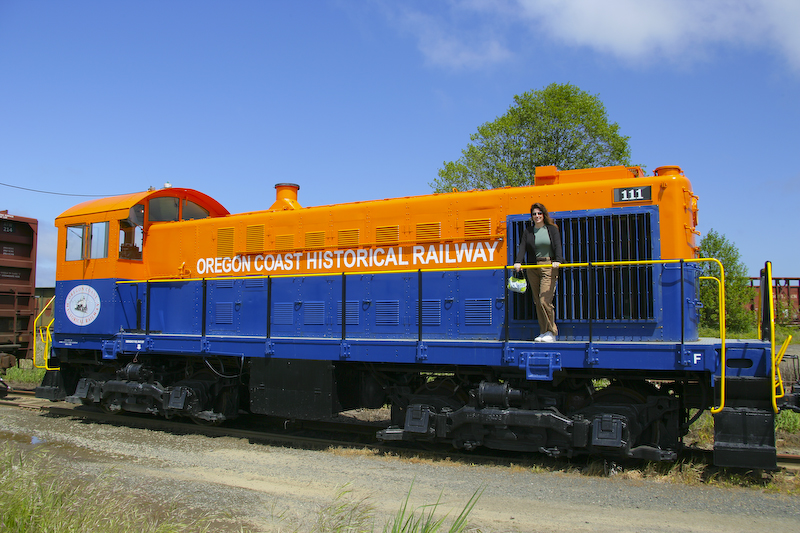 The museum in Coos Bay also had this diesel-electric loco that was donated by International Paper. This fellow is in good repair and very clean. Here, Kathleen inspects the equipment.
