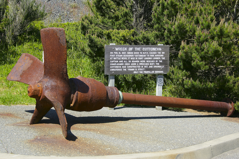 Speaking of shipping hazards, when we were at Port Orford, the wind was howling, perhaps 40 mph. The locals said that high winds are common in that area then we saw this monument to a steamer sunk in 1937 by high winds. The winds drove the ship onto the rocks and the entire crew had to be rescued. This propeller and shaft is all that remains of that 180 foot ship.