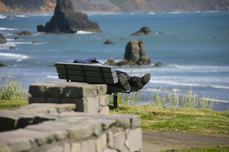 At Port Orford, we spotted this fellow passed out on the bench. He HAD to be drunk as no person in a normal state of mind could have fallen asleep in the high winds. It was just too loud to sleep unless "chemically assisted".