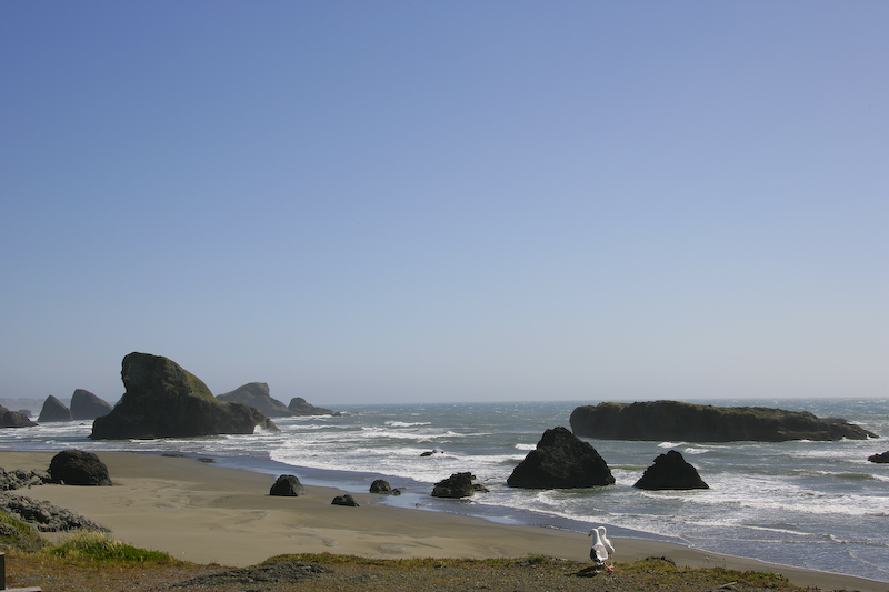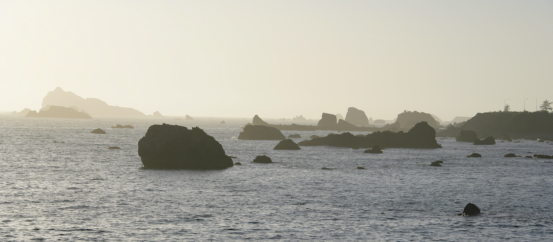 South of Port Orford, the headlands disappeared, but the offshore rocks and submerged hazards remained. South of where this shot was taken, we spotted wind surfers doing their thing in the cold waters.