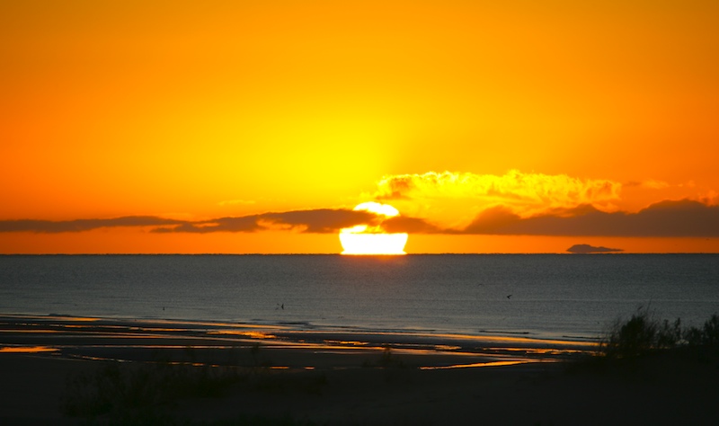 Despite the high winds, the camper was quiet and we slept well. I awoke at dawn and was able to get this shot of the sunrise over the Sea of Cortez from the tailgate of my truck. Note the distortion of the sun's disk by the ducting of light along the surface of the sea giving the sun a "flat tire" shape.