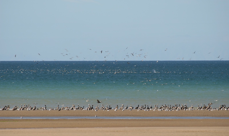 On our return down the beach, the pelicans had spotted a school of fish in the shoals near the beach. The birds circle until the exact correct moment and then they dive head-first to catch the fish. You can see the splash from one of the dives.