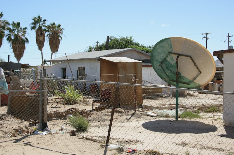 One must keep their priorities straight. This fellow has purchased a satellite TV dish, but still has a pit toilet in the backyard.