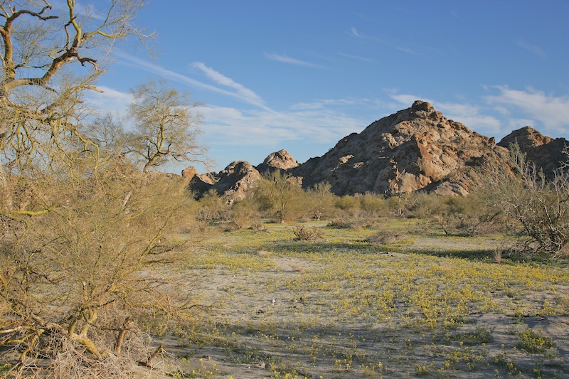 The flowers on the bajada were in full bloom providing a carpet of yellow and purple flowers.