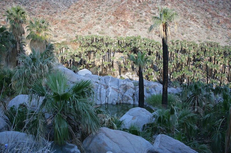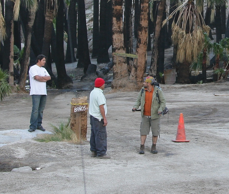 A view of the palm trees that were damaged by the fire at the camp site. Adam advised that the fire was intentional and was set while the owners were out of the area. They have re-built most of the camp, but the trunks of the palms remain fire blackened and will likely remain so forever.