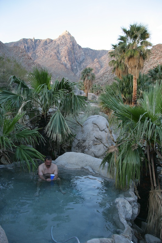 Kai relaxes in the very hot water of our hot tub with an awe-inspiring view of Pico Guadalupe in the background. Some of the palms were spared the fire.